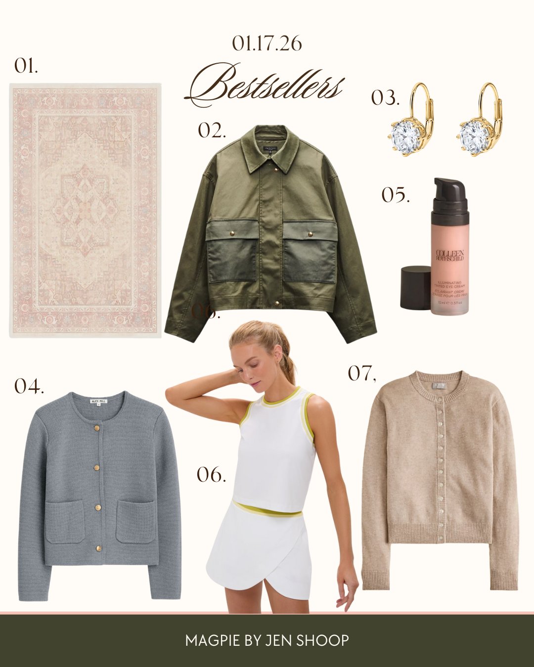 01. PINK RUG (CODE JEN15) // 02. RAG + BONE JACKET // 03. BENTLEY EARRINGS (USE CODE SHOOP20) // 04. ALEX MILL SWEATER JACKET // 05. BEST TINTED EYE CREAM // 06. TENNIS SET // 07. CASHMERE CARDIGAN // 08. BEST UNDERWEAR EVER // 09. SWEATPANT JEANS // 10. LAPTOP COVER