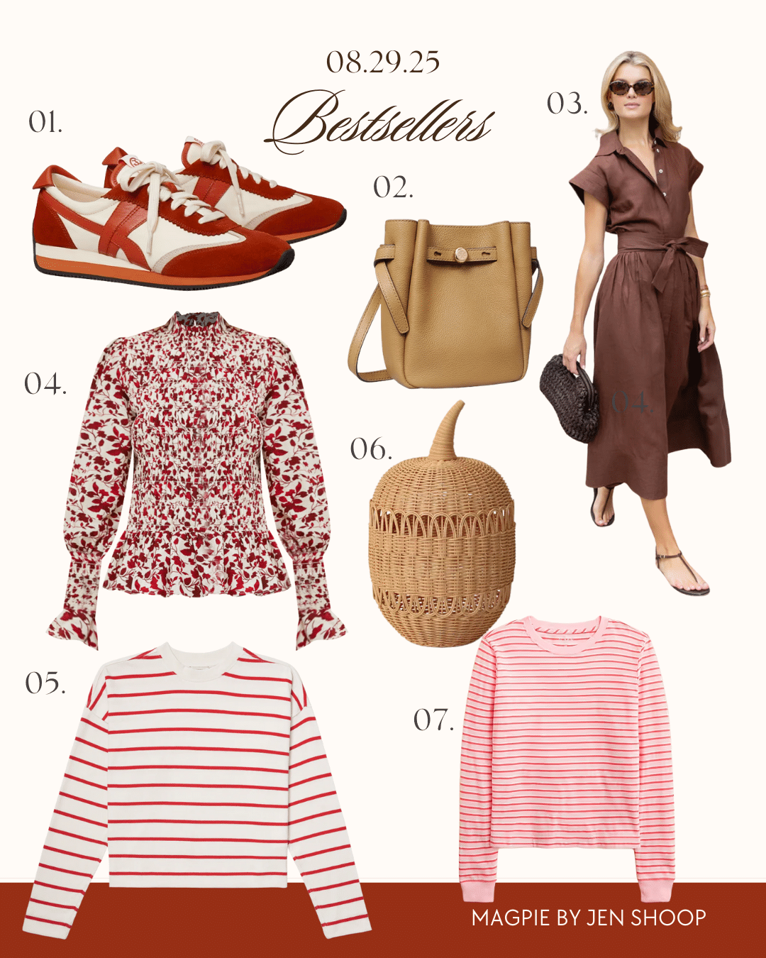 01. TORY BURCH SNEAKERS // 02. TORY BURCH MINI CROSSBODY // 03. BETTY DRESS // 04. TUCKERNUCK BLOUSE // 05. AYR HALF DAY TEE // 06. RATTAN PUMPKINS // 07. STRIPED J. CREW TEE // 08. WRAP SWEATER // 09. LA LIGNE LOOK FOR LESS // 10. BOMBAS RUFFLE PERFORMANCE SOCKS