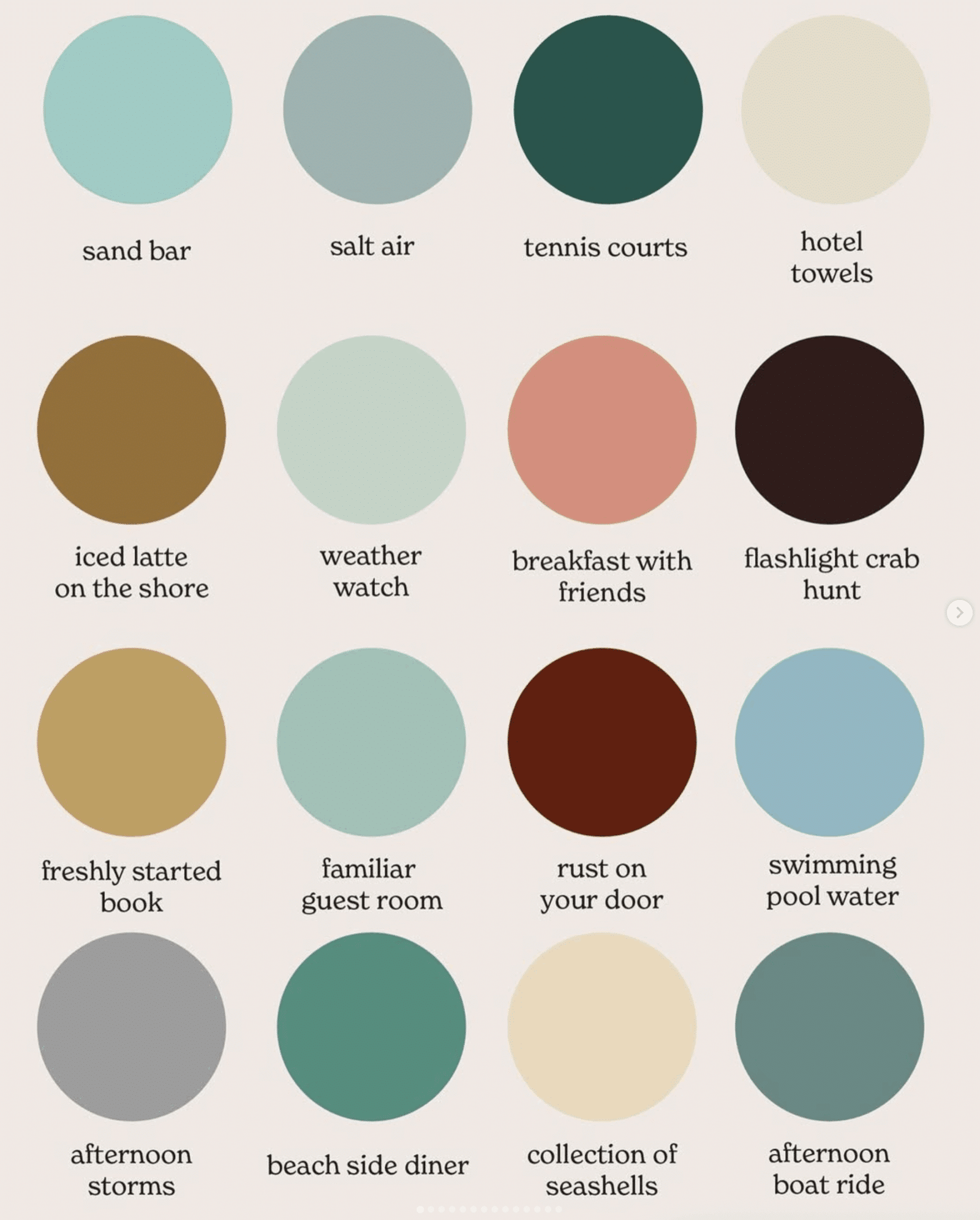 +AN END OF SUMMER COLOR PALETTE: I loved this late-August palette and the evocative terms beneath from Jenna Is Feeling. It made me wonder about which ones will last into fall? Surely the freshly started book, the latte on the shore (now hot, not iced). We’ll mix in a cranberry-colored sunset and a mocha-hued afternoon coffee date.