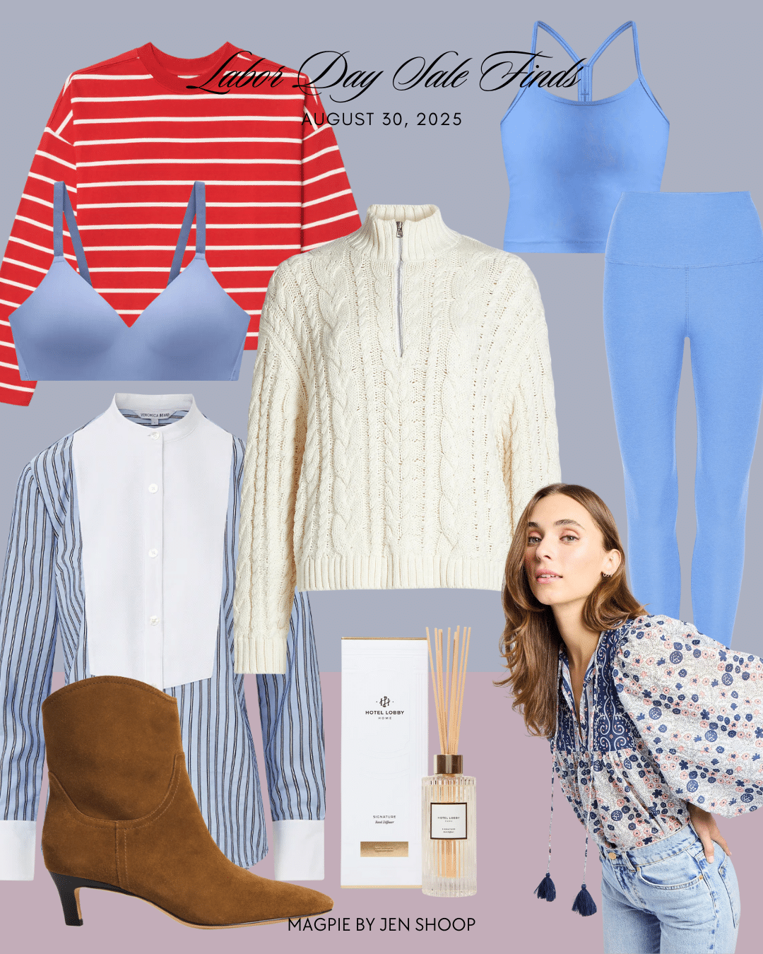 AYR HALF DAY TEE // BEST BRA // VERONICA BEARD BUTTON-DOWN // CHIC FALL BOOTS // JENNI KAYNE SWEATER (MORE HERE) // BEYOND YOGA TANK AND LEGGINGS // HOTEL LOBBY DIFFUSER (PROMO: BUY ONE GET A REFILL FREE) // MILLE TOP (50% OFF)