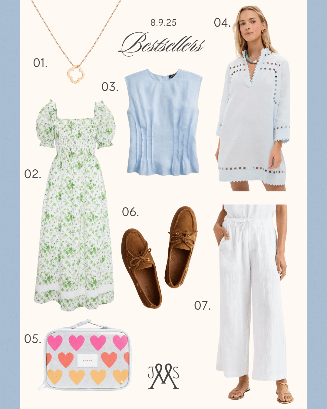 01. CHARM NECKLACE // 02. HILL HOUSE SCARLETT DRESS // 03. J. CREW PINTUCK TOP // 04. TUCKERNUCK TUNIC // 05. STATE BAGS LUNCHBOX // 06. BOAT SHOES // 07. PALAZZO PANTS // 08. SUEDE BOOTS // 09. AYR PANTS // 10. JOAN NECKLACE