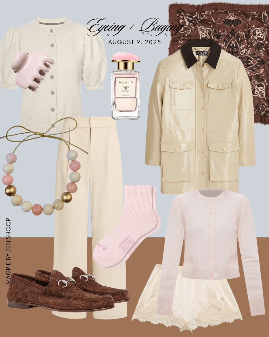 BROCHU WALKER CARDIGAN // UNDO HAIR CLIP // NICOLA BATHIE NECKLACE // VARLEY PANTS // PEONY PERFUME // J. CREW WAXED BARN JACKET // BANDANA SCARF // BOMBAS SOCKS // TUCKERNUCK CASHMERE CARDI // DOEN TAP SHORTS (LOOK FOR LESS HERE) // GUCCI LOAFERS