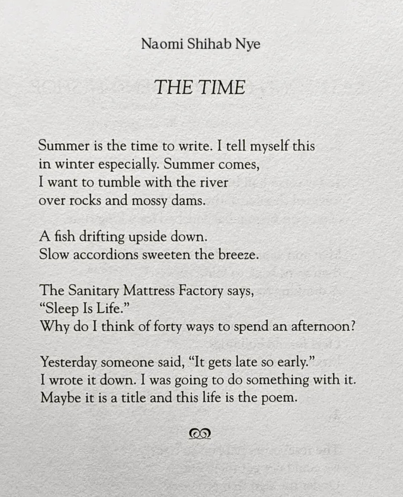 +SUMMER IS THE TIME TO WRITE: A gorgeous and evocative poem to carry with us by Naomi Shihab Nye, whether you are a writer or not. I love its get-up-and-go, especially the question: “Why do I think of forty ways to spend an afternoon?”