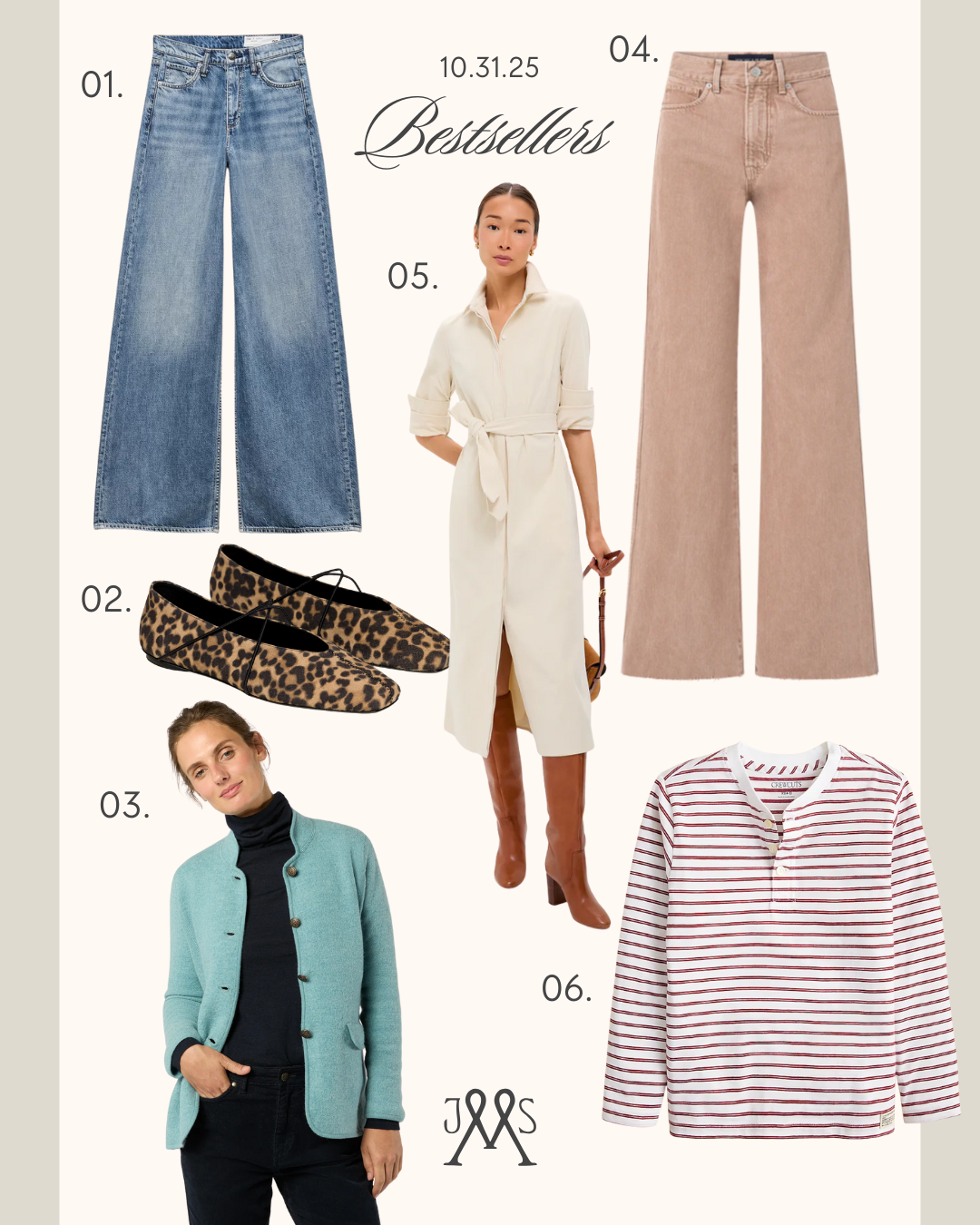 01. RAG + BONE FEATHERWEIGHT WIDE LEG JEANS // 02. M. GEMI UNA FLATS // 03. ANN MASHBURN JACKET // 04. VERONICA BEARD TAYLOR JEANS // 05. WIDE WALE CORD DRESS // 06. BOYS’ STRIPED HENLEY // 07. J. CREW LADY JACKET // 08. PUFFER VEST // 09. WIDE LEG CORDS // 10. TORY BURCH VEST
