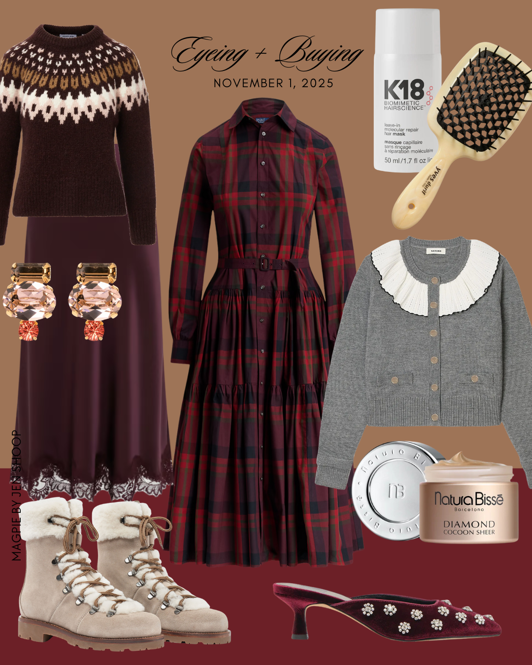 VB FAIR ISLE (LOOK FOR LESS HERE) // TUCKERNUCK SKIRT // JENNIFER BEHR EARRINGS // SCAROSSO BOOTS // RL PLAID DRESS // K18 HAIR MASK // BEST BRUSH EVER // SANDRO SWEATER // VELVET MULES // NATURA BISSE DIAMOND COCOON SHEER CREAM