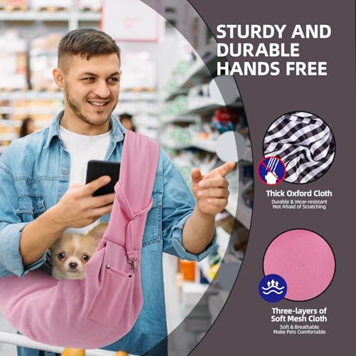 Dog Carrier Sling – Reversible Puppy Carrier Purse with Storage Pocket, Hand-Free Dog Sling Carrier for Carry Small Dogs and Cats, Travel Safety Harness, Dog and Cat Harness (Pink)