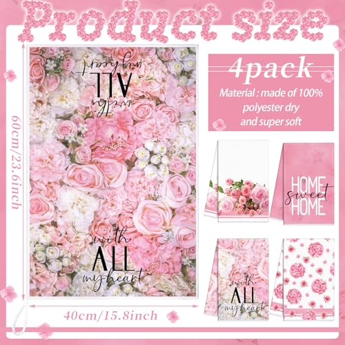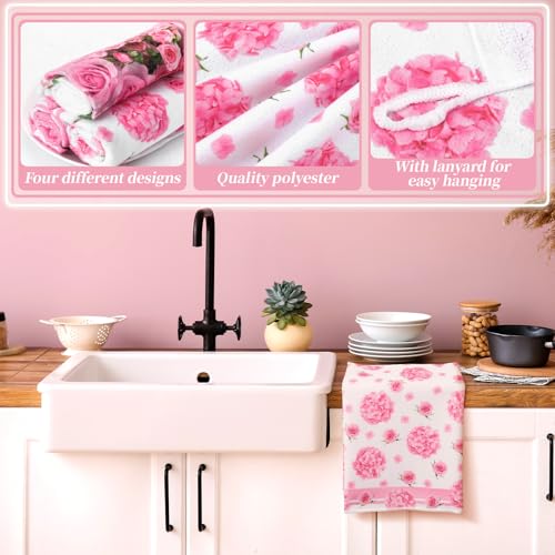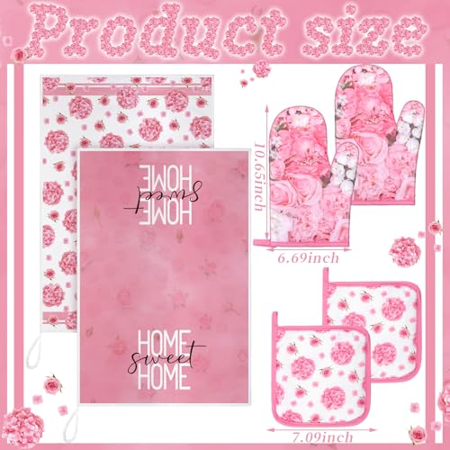 Leinuosen 8 Pcs Pink Rose Kitchen Towels and Dishcloths Sets Oven Mitts and Pot Holders Sets Absorbent Kitchen Gloves Potholders Heat Resistant for Chef Baking Cooking