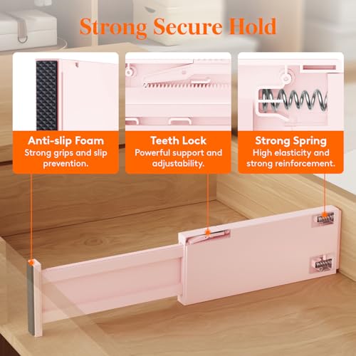 Easy Installation & Removal: Press the top button to adjust the length before placing, and stretch it out again to secure it tightly before locking it. The strong spring tension keeps each drawer organizer securely upright. To retract, press the top button and push the stretched side.