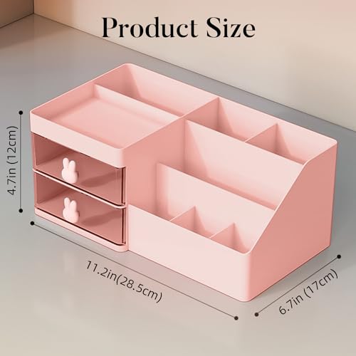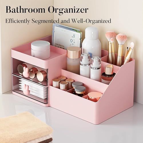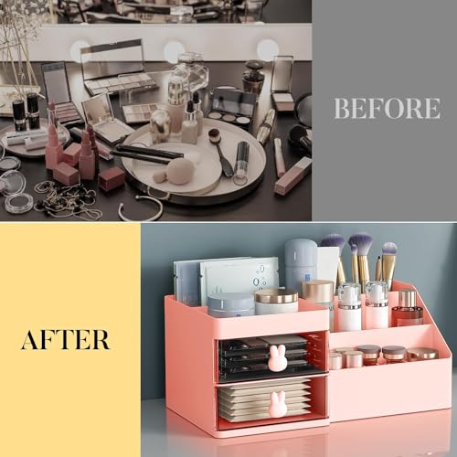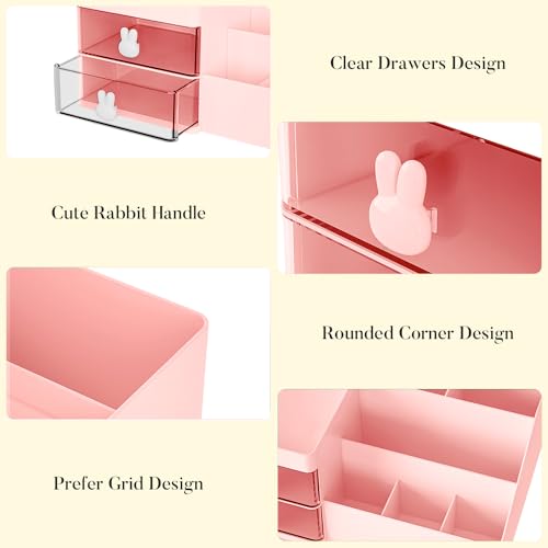 Makeup Organizer, Cosmetic Desk Storage Box with Drawers Skincare Organizers for Dressing Table, Countertop, Bathroom Counter, Vanity Holder for Brushes, Lotions, Lipstick, Perfume (Pink-Clear)