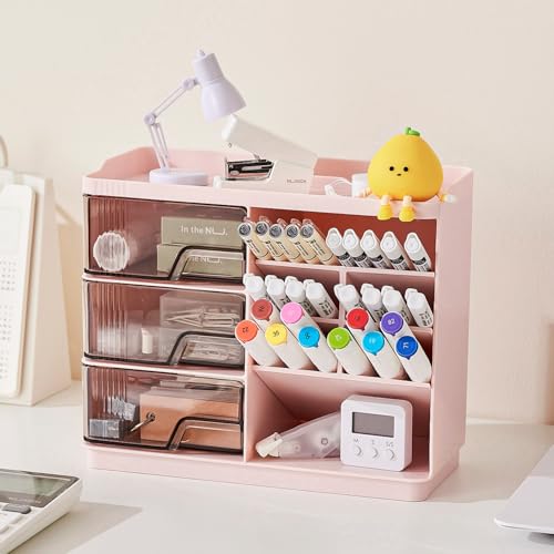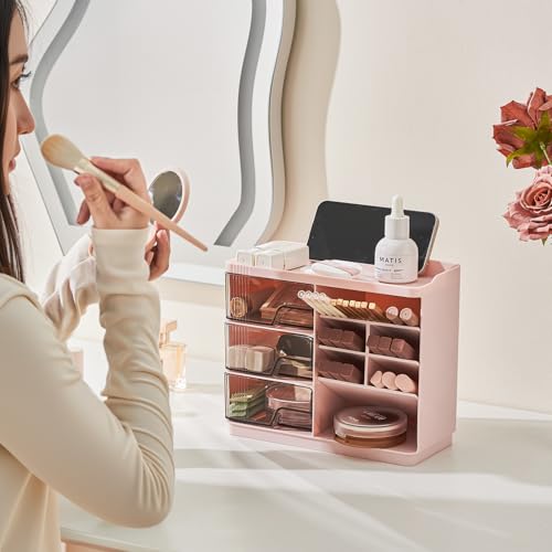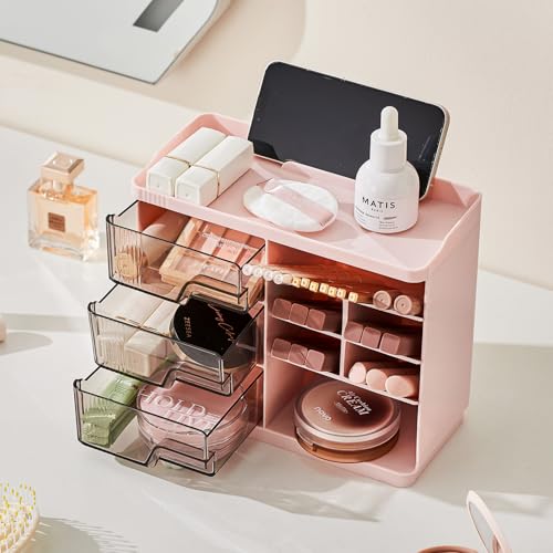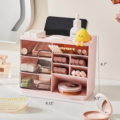 Makeup Organizer Countertop with 3 Drawers, Multi-Function Desktop Vanity Organizer for Skincare Makeup Brush Lipstick, Bathroom Counter Organizer, Pink