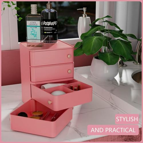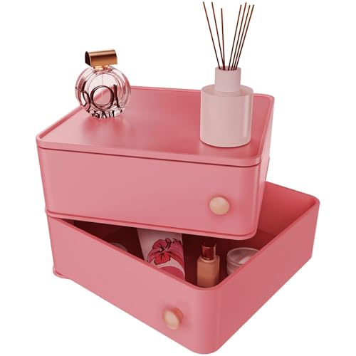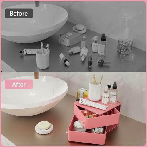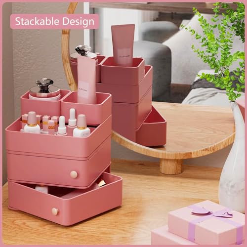 Makeup Organizer with Rotating Drawers: Stackable Makeup Bathroom Vanity Storage Box, Desk and Dresser Countertop Organizers and Storage Boxes for Cosmetics, Skincare, Jewelry, Bracelets, Pink