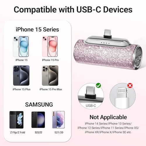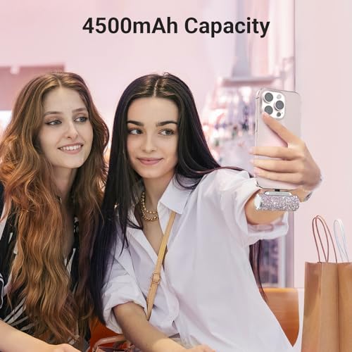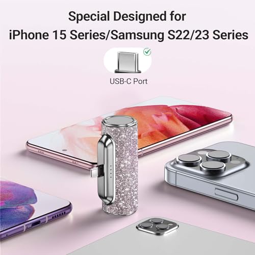 Mini Portable Charger USB C Small Power Bank 4500mAh, Bling Cute Battery Pack for iPhone 16 15 /Pro/Pro Max/Plus, Samsung Galaxy S24/S23/S22, Android Cell Phone etc, Shiny Pink