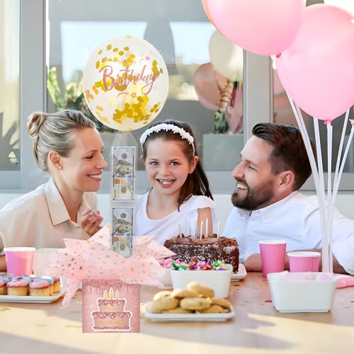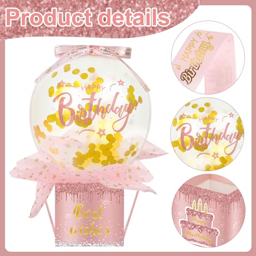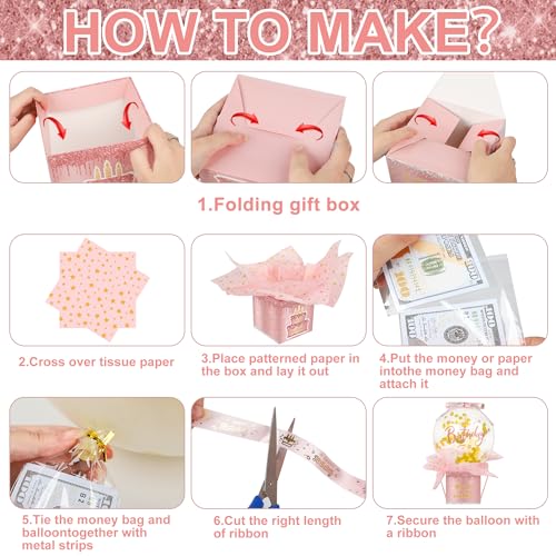 Package content: you will receive a birthday gift surprise set, including 2pcs birthday balloons, 1pcs rose gold money gift box, 1pcs ribbon, 2pcs tissue paper, 30pcs transparent bags, 2pcs golden metal cable ties, sufficient quantity to meet your decoration needs, perfect surprise gift for birthday party.
