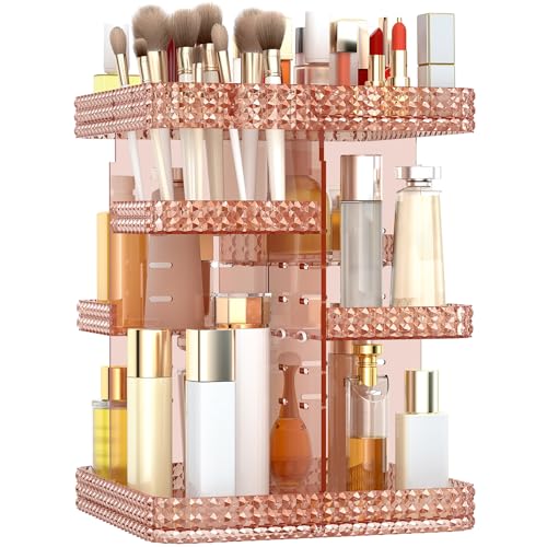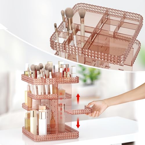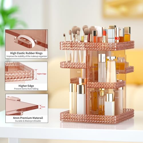 Rotating Makeup Organizer, Large Capacity Cosmetic Display Case, Acrylic Skincare Organizer with Makeup Brush, Makeup Storage Organizer for Dresser Countertop and Bathroom Vanity – Pink