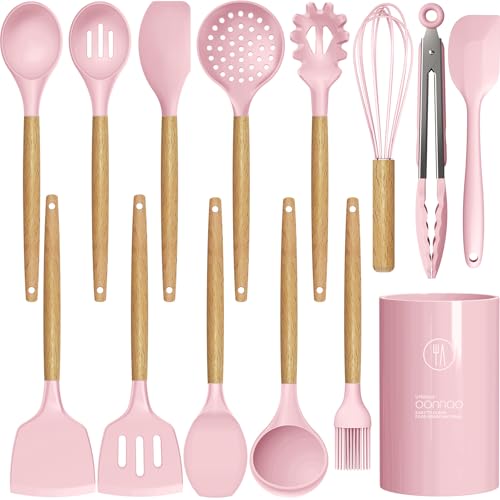 Silicone Kitchen Utensils Set – 446°F Heat Resistant Cooking Utensil Sets, Spatula,Turner,Tongs,Spoon,Brush,Whisk, Wooden Handle Silicone Kitchen Gadgets Tools for Non-Stick Cookware BPA Free (Pink)