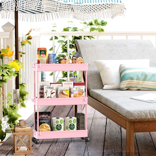 SPACEKEEPER Slim Rolling Storage Cart, 3 Tier Bathroom Organizer Utility Cart Laundry Room Organization Mobile Shelving Unit for Kitchen, Bathroom, Office, Bedroom, Narrow Places, Pink