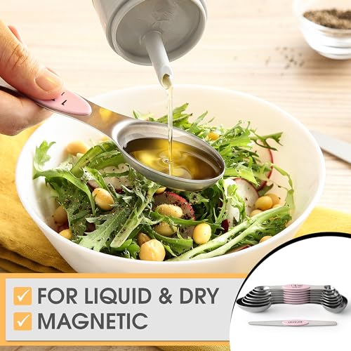 Spring Chef Stainless Steel Magnetic Measuring Spoons Set of 8 with Leveler, Dual Sided Teaspoon & Tablespoon Measuring Spoons with Strong Magnets, Kitchen Gadgets for Baking & Cooking – Pink Lemonade